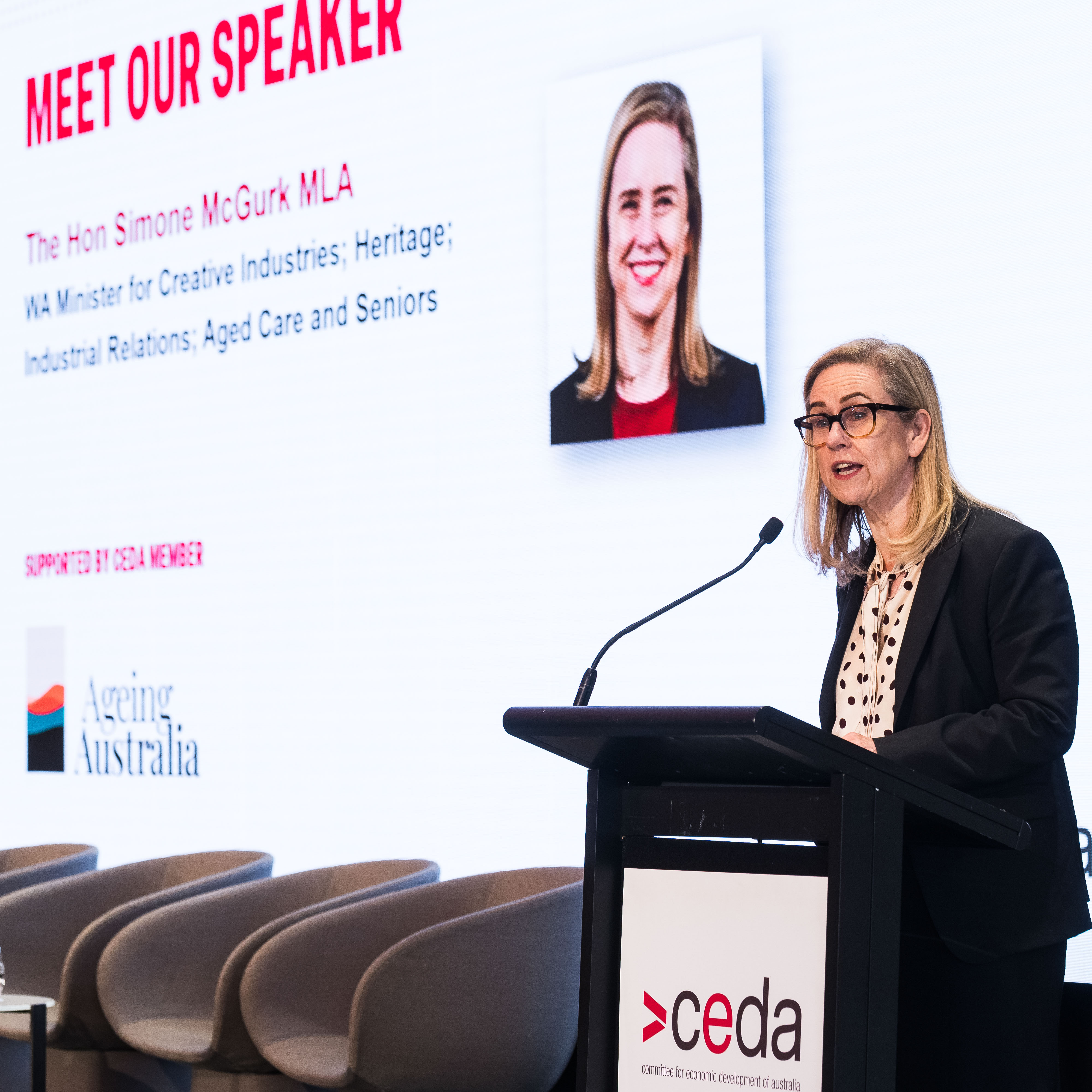 CEDA's Perth audience heard directly from the Hon. Simone McGurk MLA, WA Minister for Creative Industries; Heritage; Industrial Relations; Aged Care and Seniors, and she was later joined onstage by an expert panel, who included: