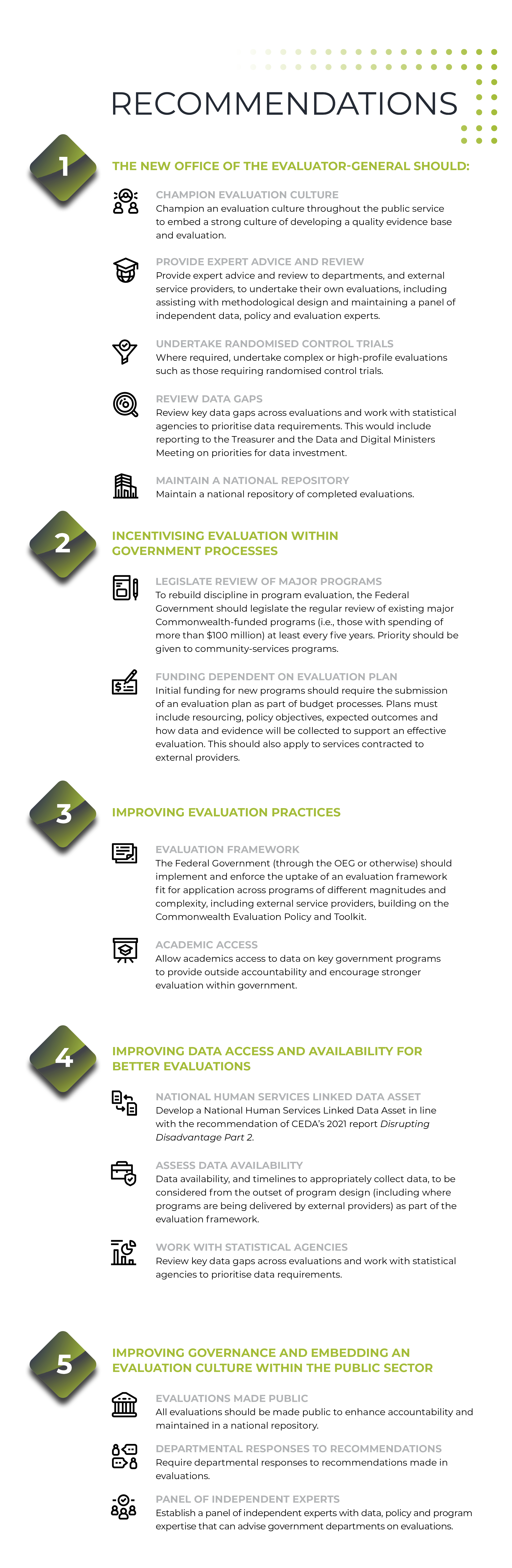CEDA recommends that an OEG would primarily champion and steward evaluation and develop capability and capacity throughout the public service. Evaluation activity would continue to be primarily undertaken at the departmental level. An OEG is not the solution to all the problems with evaluation, but it is the kind of circuit breaker needed to drive change.